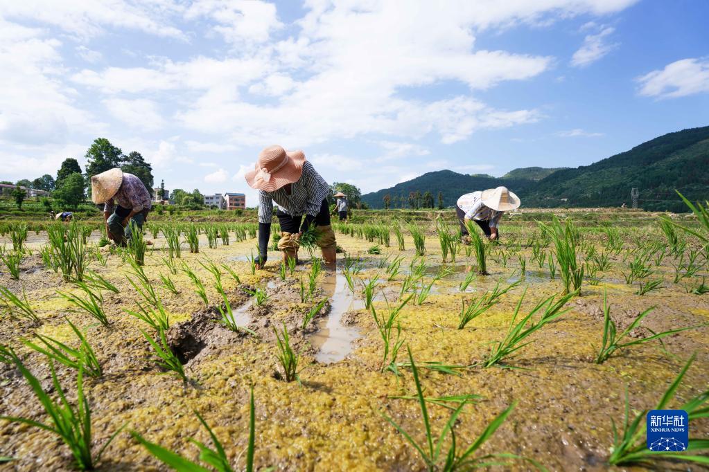 5月29日,村民在岑鞏縣水尾鎮新場村的雜交水稻制種基地移栽制種水稻秧苗。
