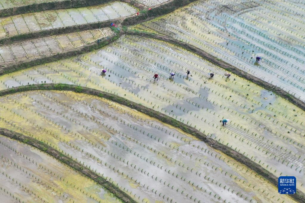 5月29日,村民在岑鞏縣水尾鎮新場村的雜交水稻制種基地移栽制種水稻秧苗(無人機照片)。