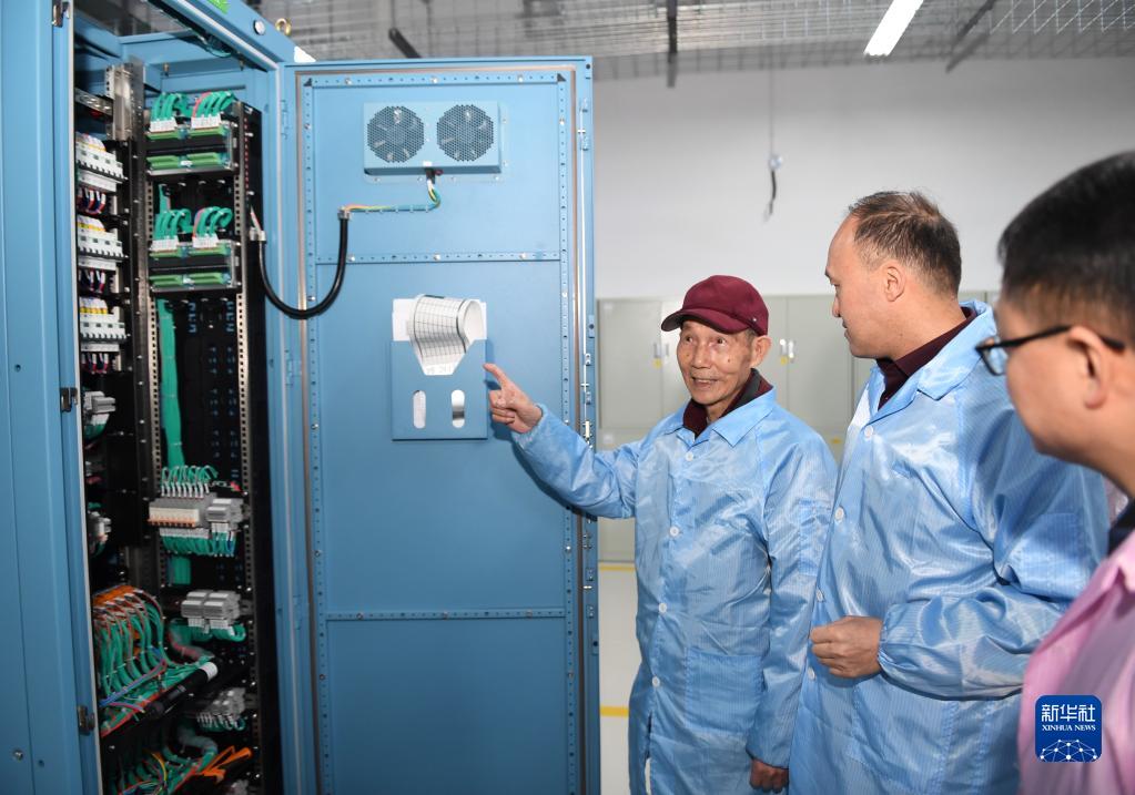 3月3日,在龍鱗系統生產基地,魏昌武(左)、劉艷陽(中)在龍鱗系統機柜前交流。