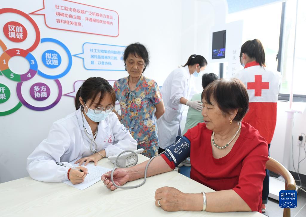 5月30日,埭溪鎮中心衛生院的醫務人員在為老年人進行健康問診。