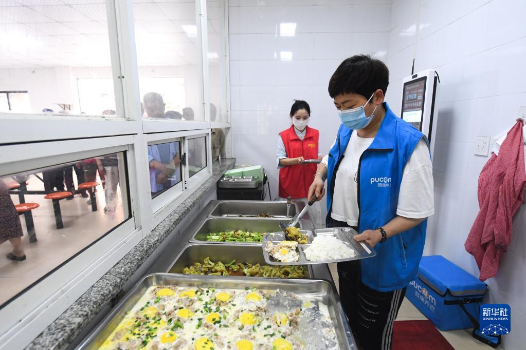 5月30日,在埭溪鎮中央食堂,工作人員為老年人打飯。