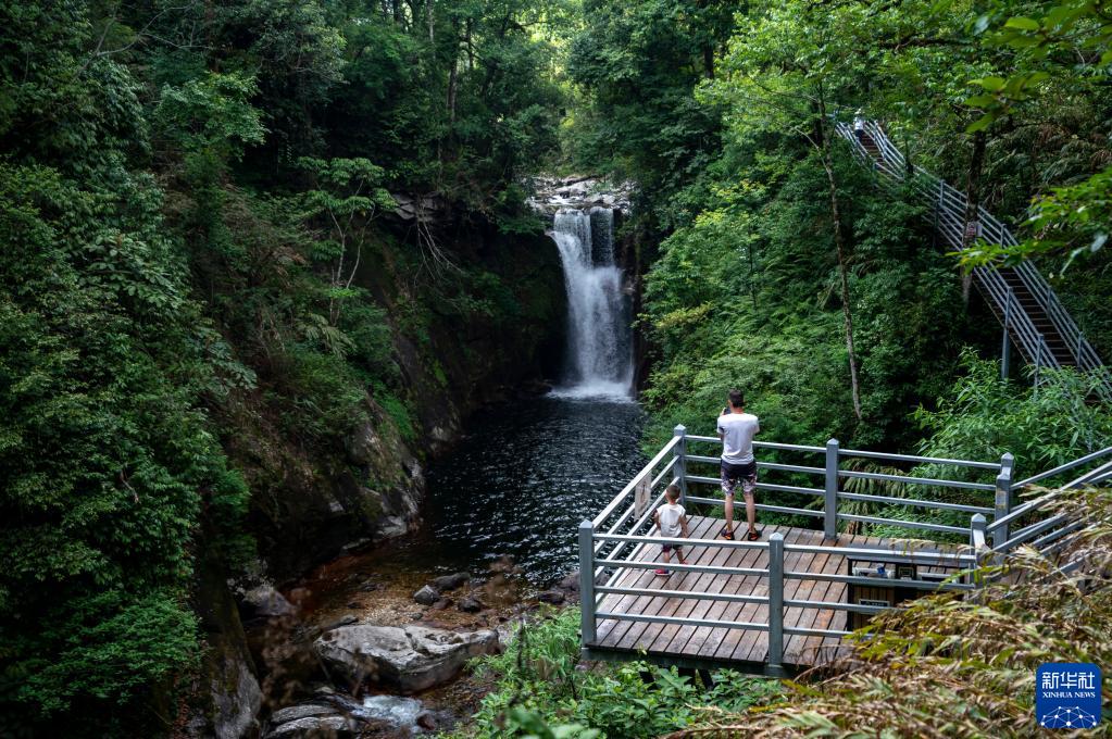 5月29日,游客在坪河草地景區一觀景臺拍攝瀑布。
