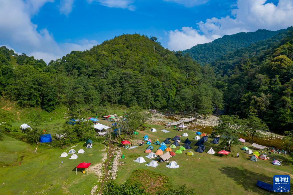 5月29日,游客在坪河草地景區露營(無人機照片)。