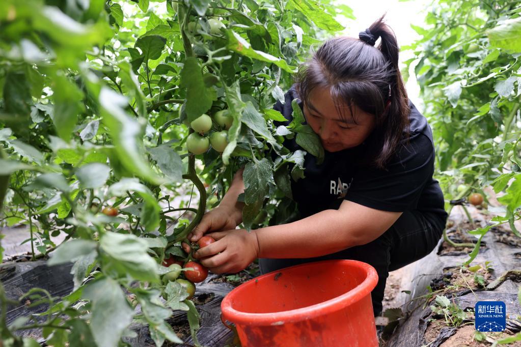 5月30日,在石家莊市欒城區崗頭村一家農業采摘園,工作人員采摘西紅柿。