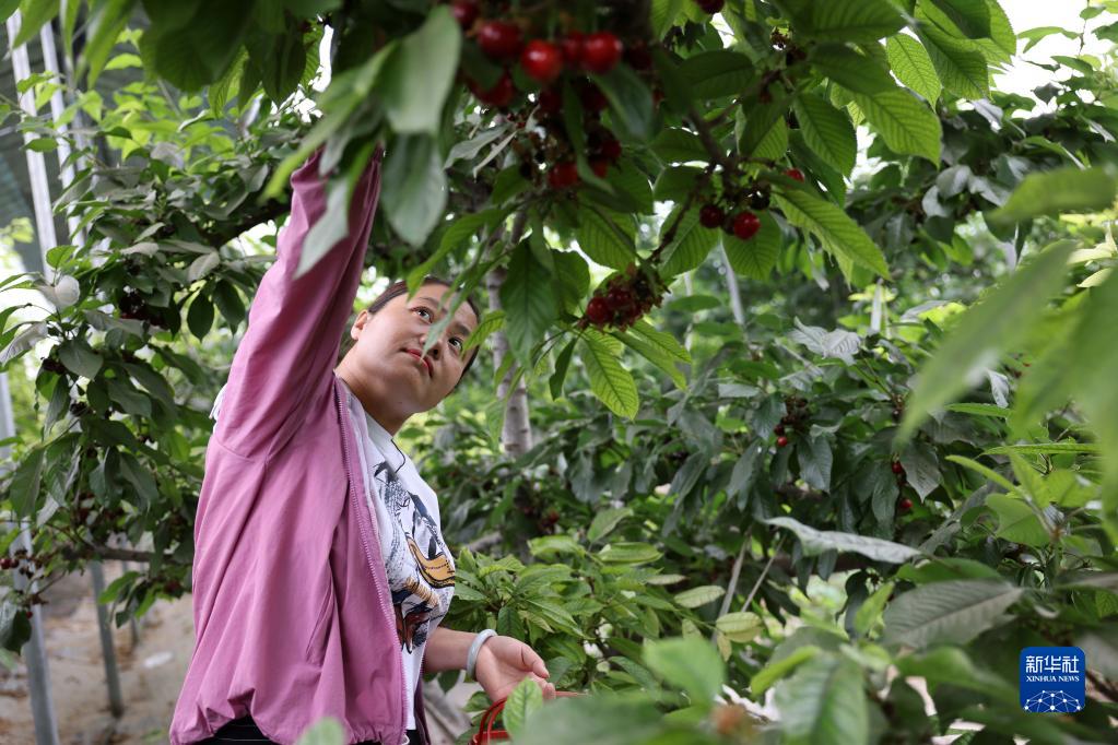 5月30日,游客在石家莊市欒城區西宮村大棚櫻桃種植園采摘櫻桃。