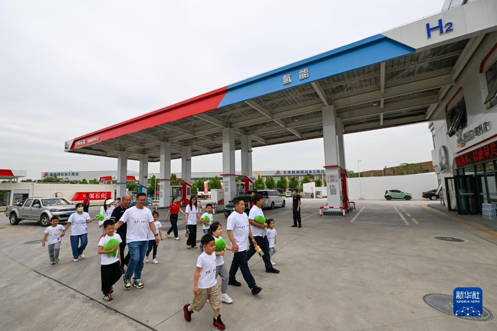 5月30日,小朋友和家長在工作人員帶領下參觀位于天津空港經濟區的“油氣氫電服”綜合加能站。