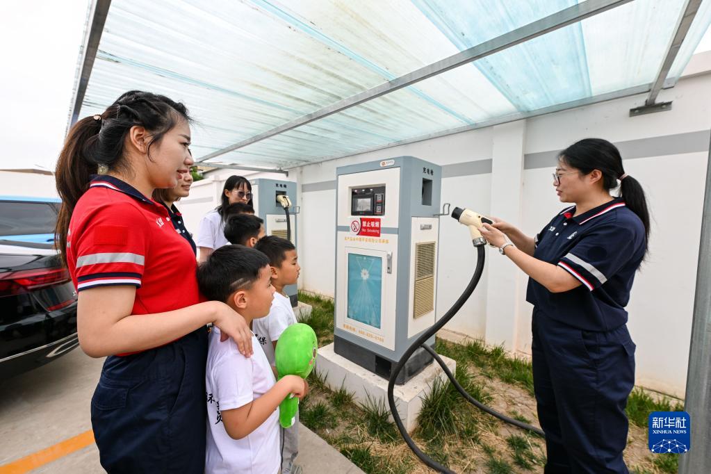 5月30日,在天津空港經濟區西十四道綜合加能站,工作人員在講解充電樁設備運行安全注意事項。