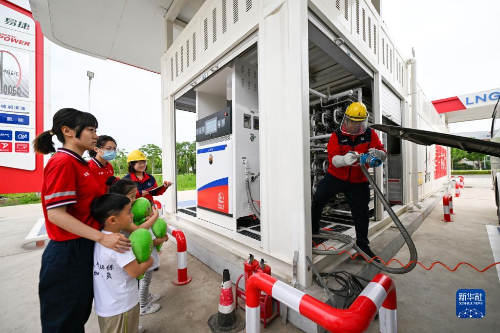 5月30日,在天津空港經濟區西十四道綜合加能站,工作人員帶領小朋友觀看操作員為車輛加注液化天然氣LNG過程。