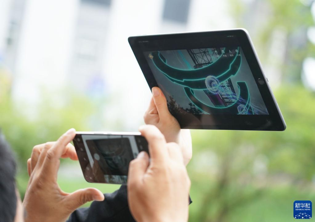 5月30日,工作人員在科幻產業新技術新產品展現場進行AR(增強現實)效果展示。