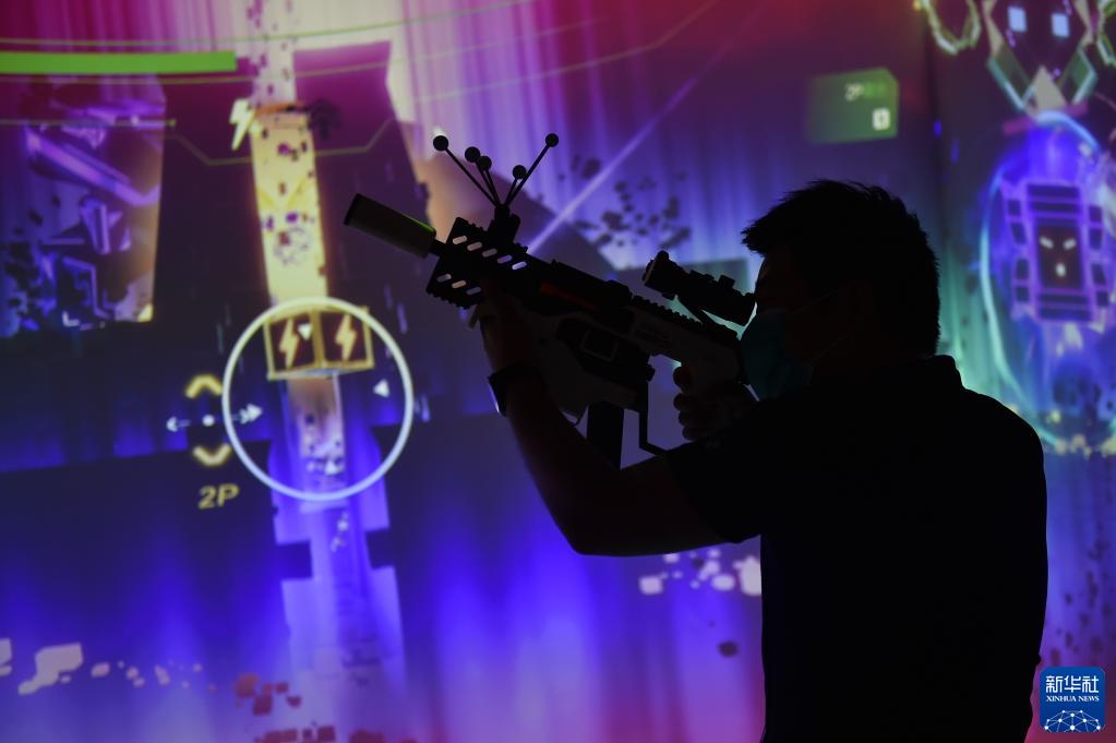 5月30日,在科幻產業新技術新產品展上,一名參觀者在體驗運用動作捕捉等技術的虛擬游戲。