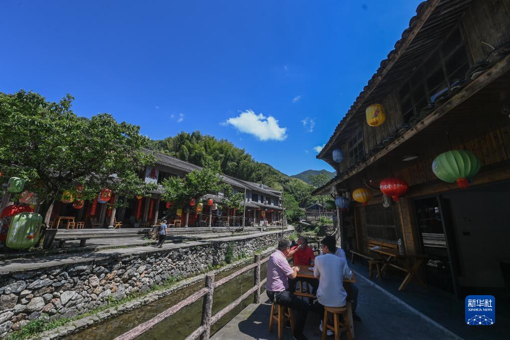 5月30日,游客和村民在布袋坑村的溪水旁喝茶。