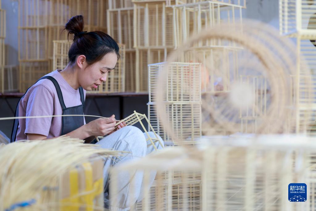 5月30日,在河北省唐山市豐南區黃各莊鎮一家鳥籠加工企業,工人在制作鳥籠。
