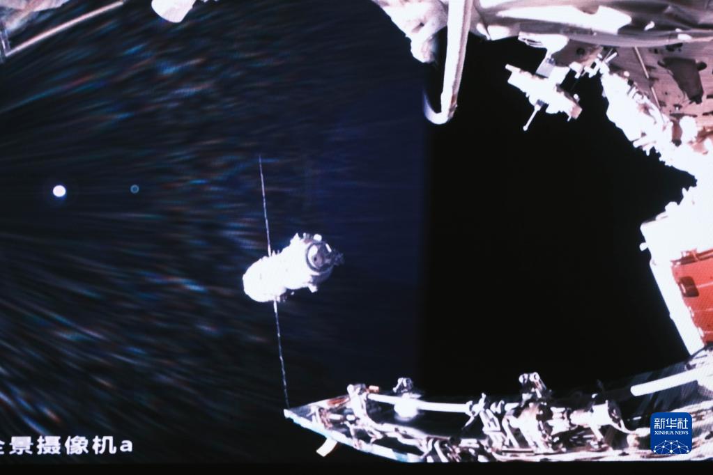 5月30日在北京航天飛行控制中心拍攝的神舟十六號載人飛船與天和核心艙進行自主快速交會對接的畫面。