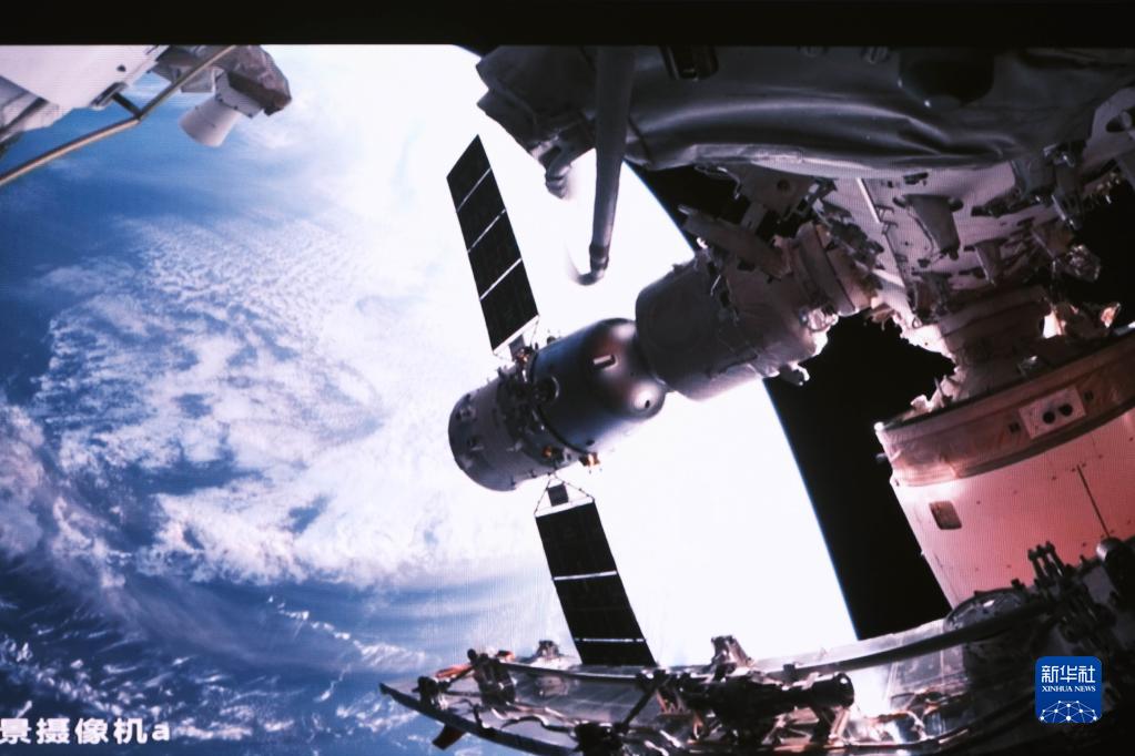 5月30日在北京航天飛行控制中心拍攝的神舟十六號載人飛船成功對接于空間站天和核心艙徑向端口的畫面。