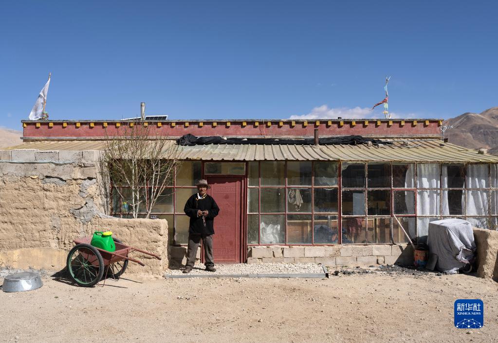 5月28日,洛桑占堆老人站在自己現在居住的房子前留影。這是他的第四個家,也是典角村的“三代房”。新華社記者 費茂華 攝