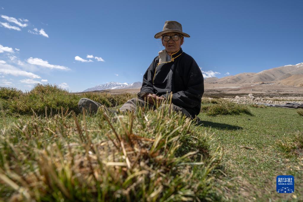 5月28日,洛桑占堆老人坐在家門口的草甸上曬太陽。新華社記者 費茂華 攝