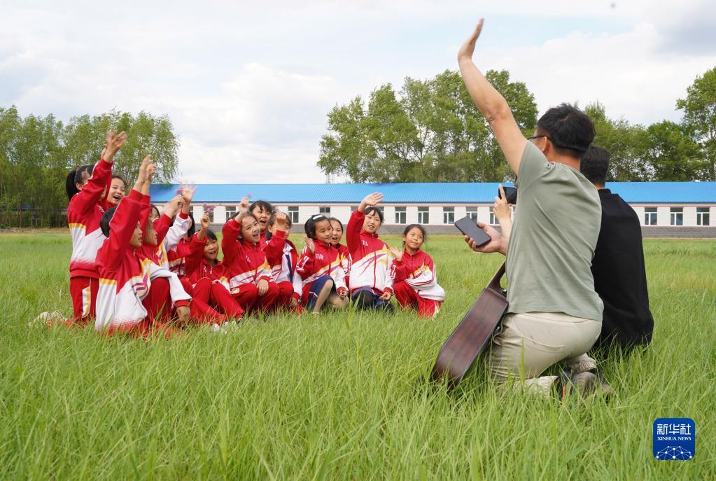 5月29日,在安達市任民鎮中心小學,音樂老師在學校草坪上給音樂班的孩子們錄制短視頻。