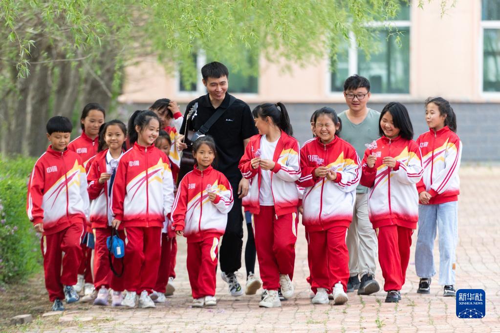 5月29日,在安達市任民鎮中心小學,音樂老師和音樂班的孩子在校園中。