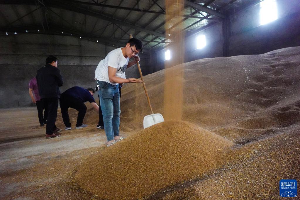 5月30日,河南省正陽縣大林鎮一家糧業公司員工對濕小麥進行烘干處理。