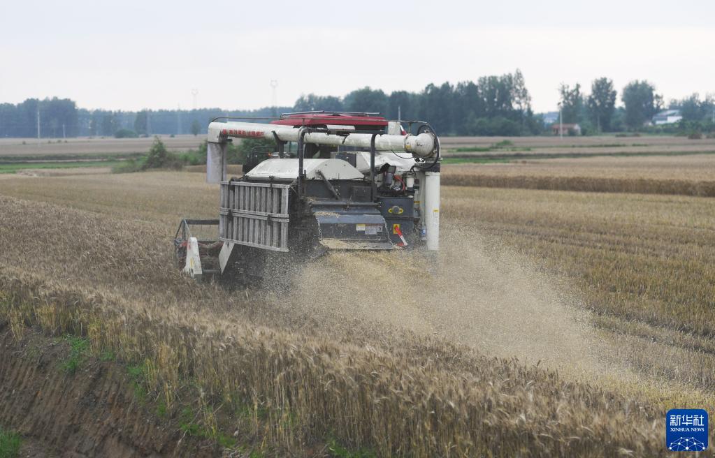 5月30日,在河南省駐馬店市正陽縣銅鐘鎮,收割機在搶收小麥。