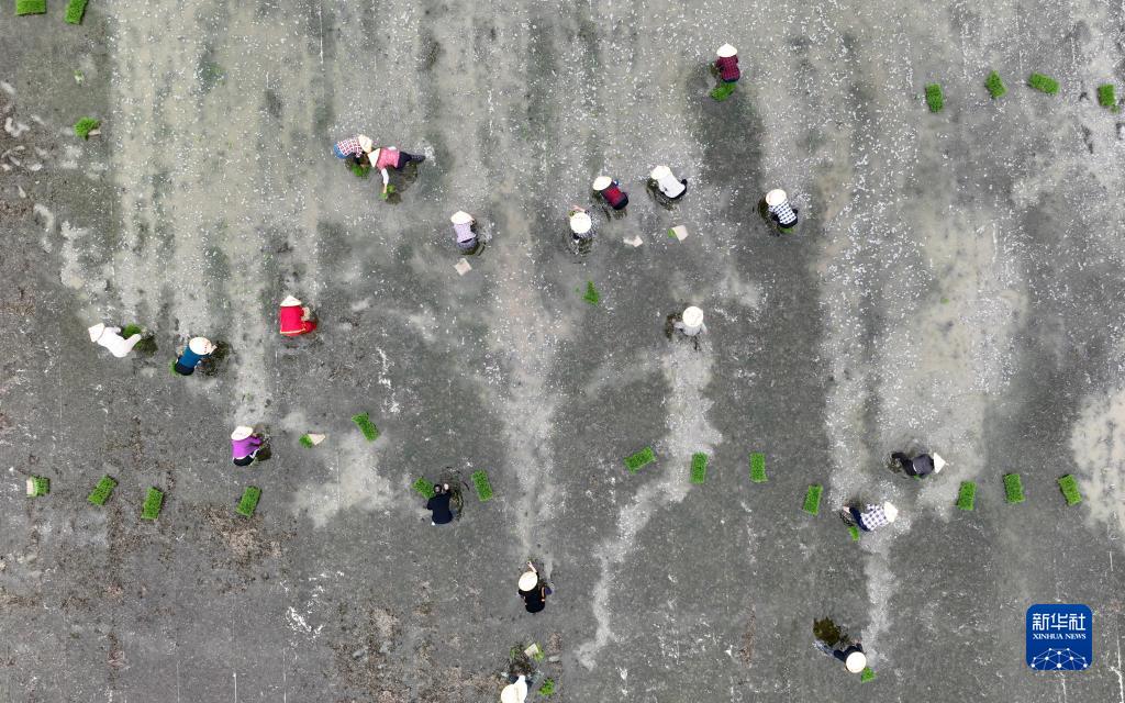5月30日,在淮安市洪澤區岔河鎮,人們在插秧節上比賽插秧(無人機照片)。
