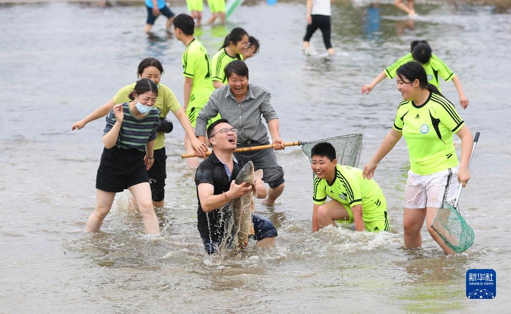 5月30日,在淮安市洪澤區岔河鎮,人們在捉魚比賽活動現場。