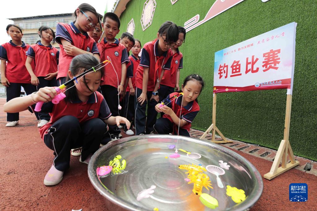 5月30日,貴州省錦屏縣城關第三小學學生在參加釣魚比賽。