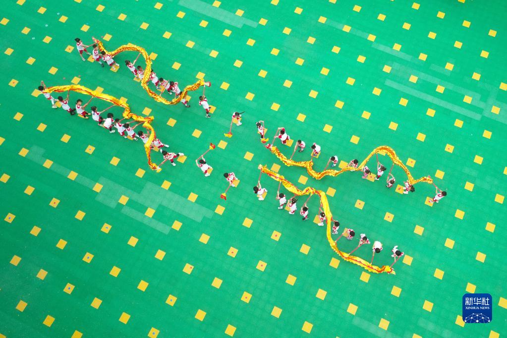 5月30日,在河北省唐山市豐潤區左家塢鎮中心幼兒園,孩子們在表演舞龍節目(無人機照片)。