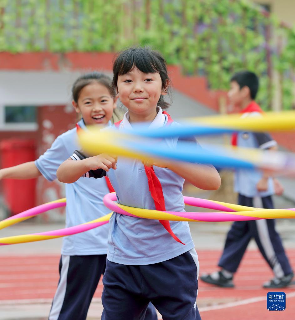 5月30日,河北省邢臺市廣宗縣第六小學學生在參加呼啦圈游戲。