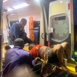 5月30日,救援人員在加納中部省大客車與油罐車相撞事故現場搶救傷者。