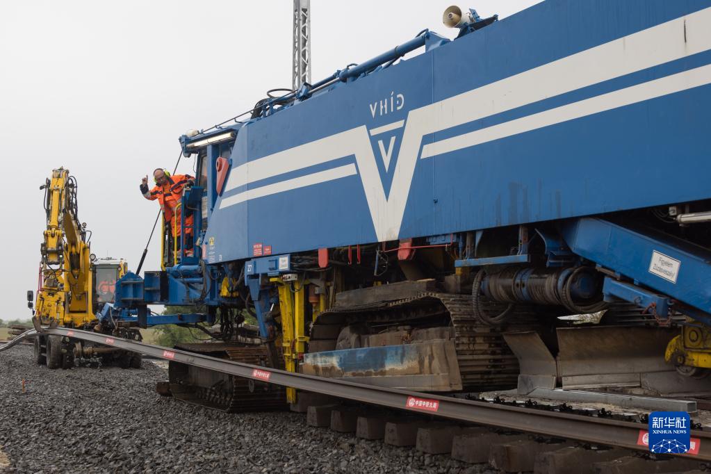 5月30日,在匈塞鐵路匈牙利段孔圣米克洛什-陶什站施工現場,工作人員操作機械鋪設鋼軌。