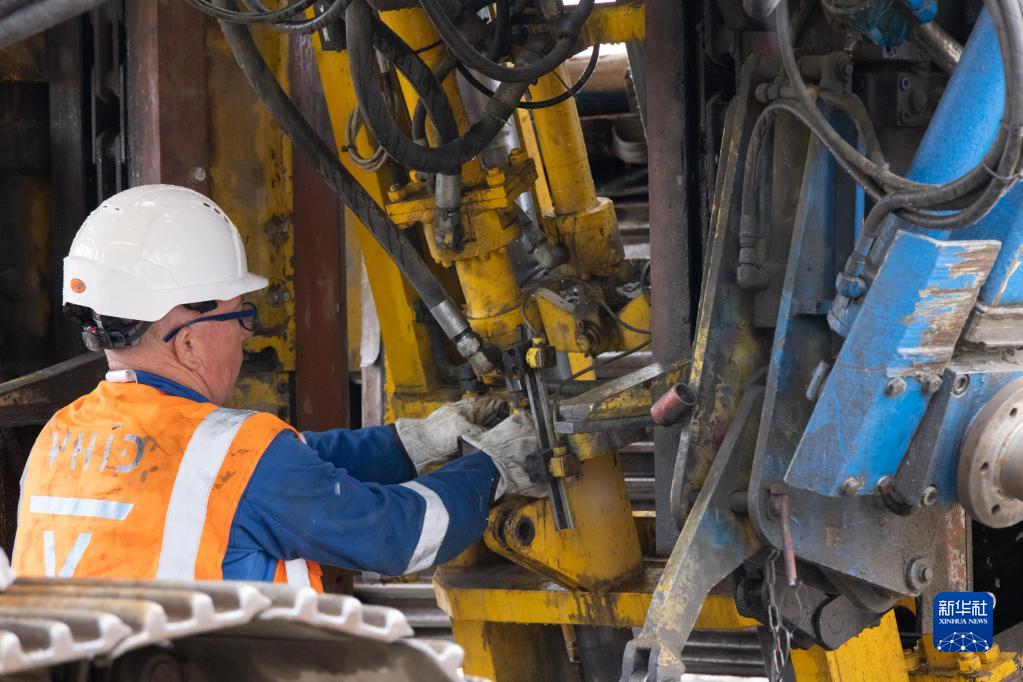 5月30日,在匈塞鐵路匈牙利段孔圣米克洛什-陶什站施工現場,工作人員啟動鋪軌前檢修鋪軌機組。