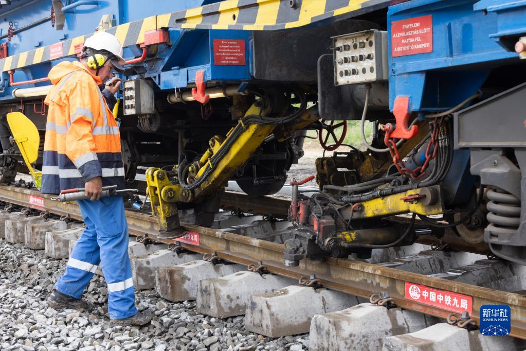 5月30日,在匈塞鐵路匈牙利段孔圣米克洛什-陶什站施工現場,工作人員調整鋪軌機作業狀態。