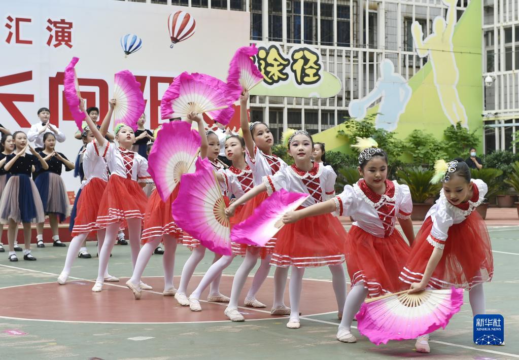 5月31日,在河南省鄭州市金水區緯一路小學,學生在文藝匯演上表演。