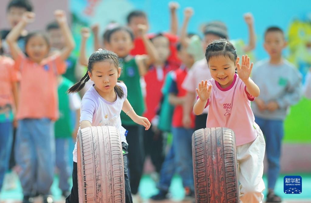 5月31日,在山東省滕州市西崗鎮一所幼兒園,小朋友在進行滾輪胎比賽。