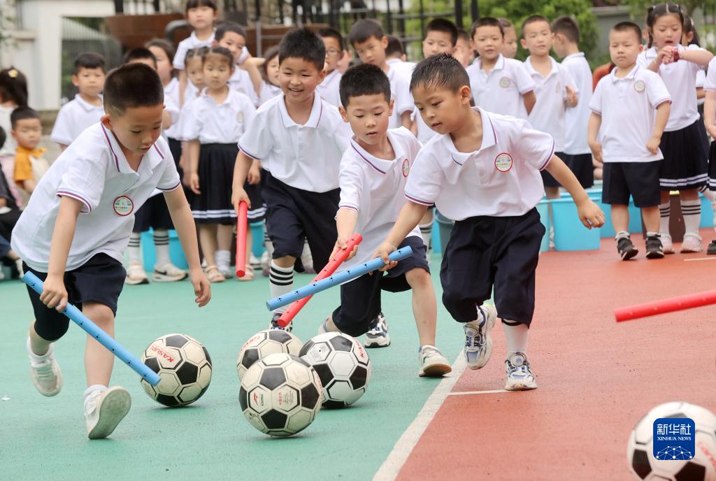 5月31日,浙江省湖州市德清縣三橋幼兒園的孩子們在進行“趕小豬”游戲。
