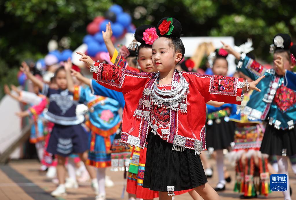5月31日,貴州省黔東南苗族侗族自治州丹寨縣示范幼兒園的小朋友在表演苗族錦雞舞。