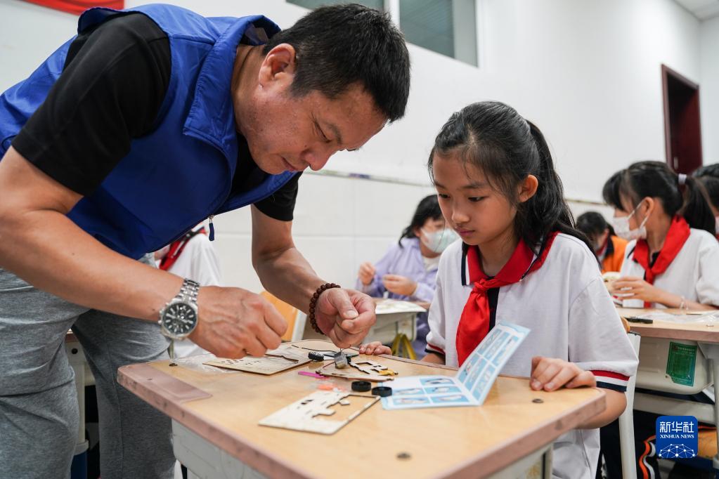 5月31日,在北京市東城區分司廳小學舉行的2023年東城區青少年科技館“玩轉科學 童心筑夢”科技嘉年華活動上,老師幫助同學制作太陽能小車。