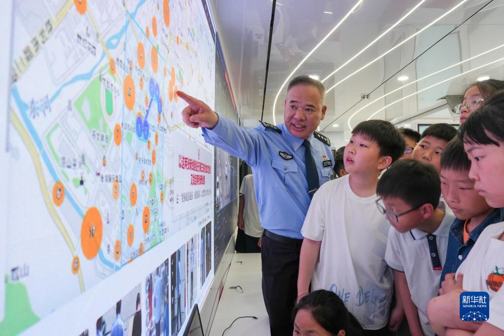 5月31日,在江蘇省丹陽市公安局,參加探訪警營活動的小學生們在參觀科技強警展車相關平臺。