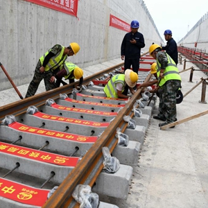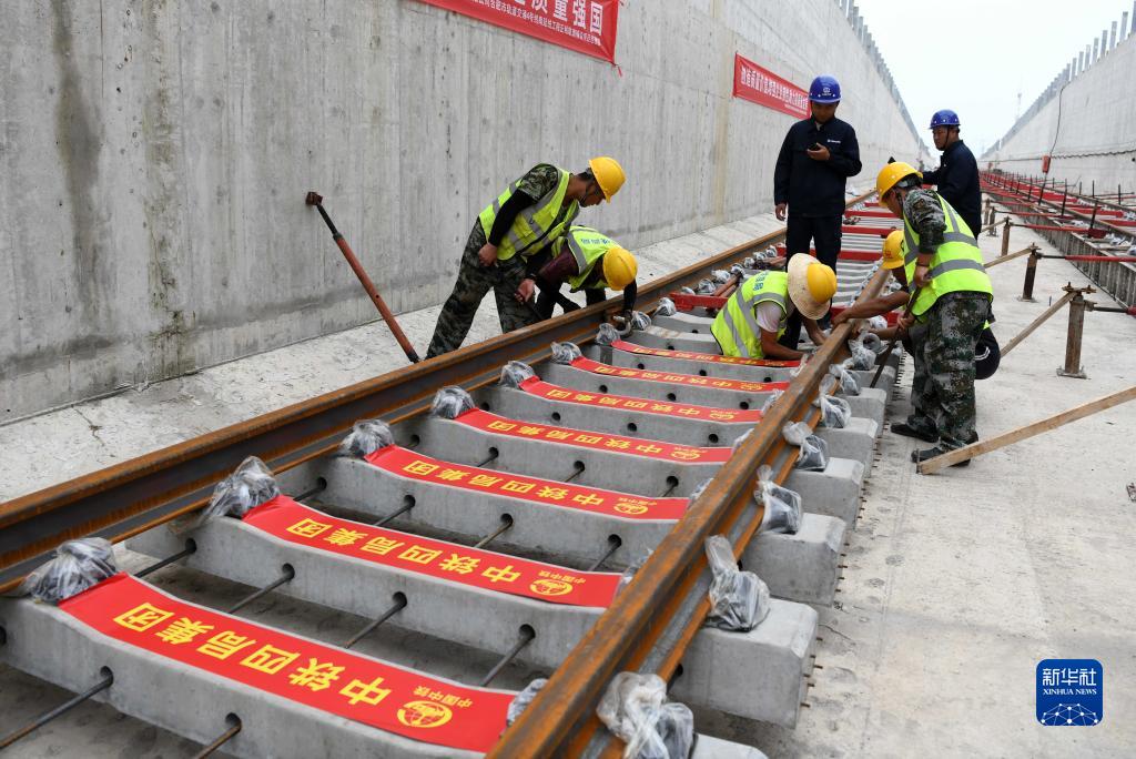 5月31日,中鐵四局施工人員在合肥軌道4號線南延線鋪軌現場作業。