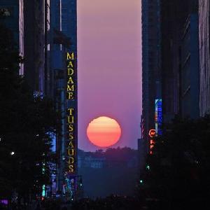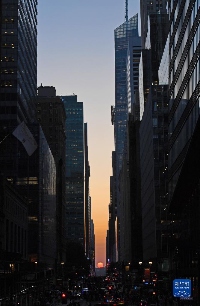 當日,紐約出現“曼哈頓懸日”景觀?!奥D懸日”是紐約市標志性景觀,每年5月和7月出現兩次,指日落時太陽正好出現在曼哈頓東西向街道正上方、似乎懸在兩側高樓大廈之間的戲劇性畫面。