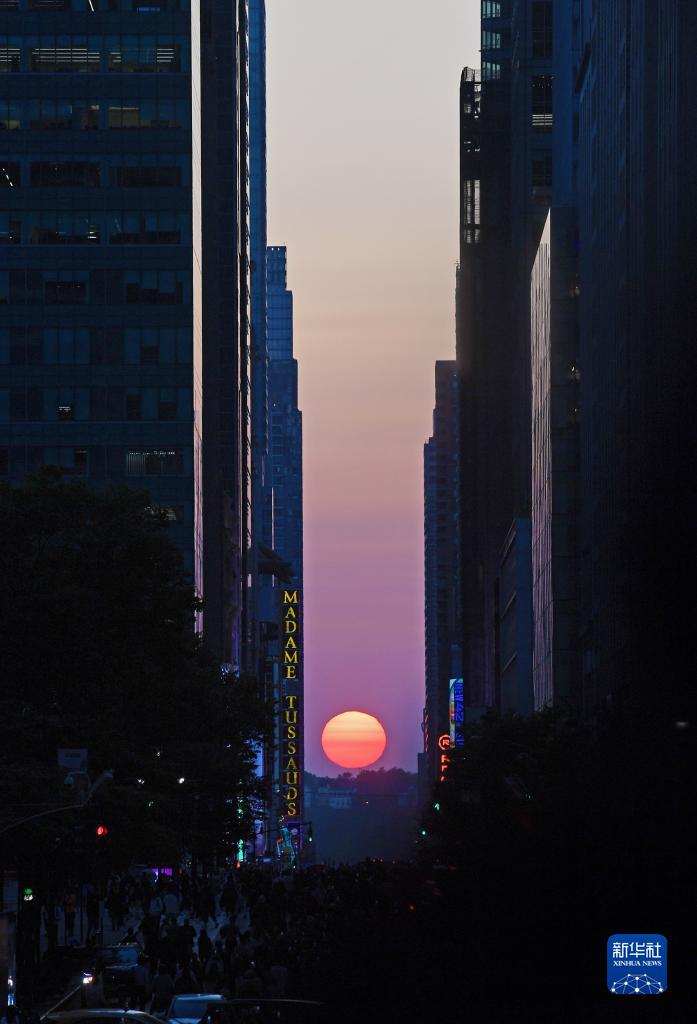 當日,紐約出現“曼哈頓懸日”景觀?!奥D懸日”是紐約市標志性景觀,每年5月和7月出現兩次,指日落時太陽正好出現在曼哈頓東西向街道正上方、似乎懸在兩側高樓大廈之間的戲劇性畫面。