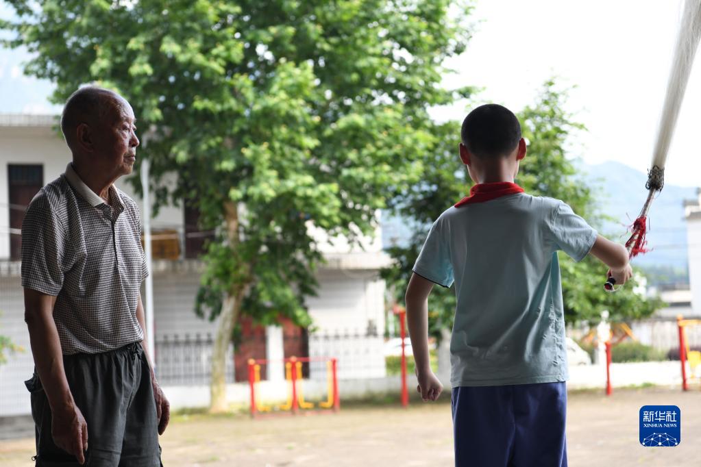 5月29日,民間老藝人邵千峰(左)在徽劇展演排練時指導一名伏嶺鎮中心小學“徽劇童子班”的學生。