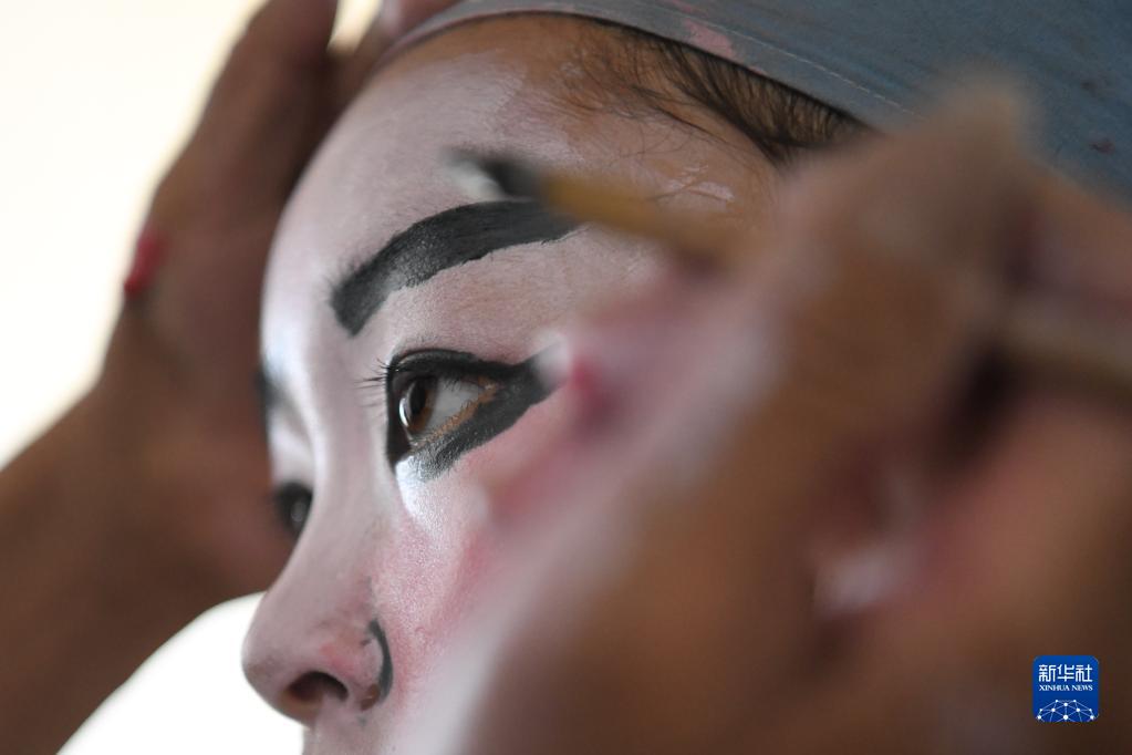 5月30日,民間老藝人在給“徽劇童子班”學生化妝。