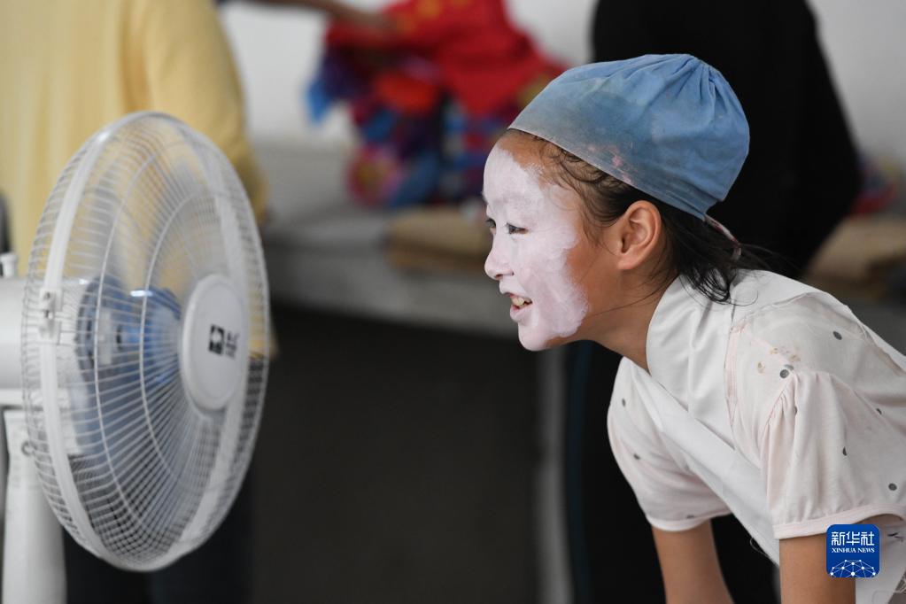 5月30日,伏嶺鎮中心小學“徽劇童子班”學生方甜甜在化妝間隙吹電扇。