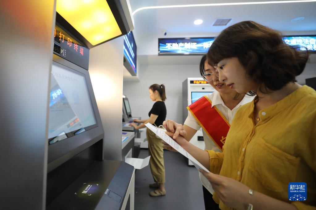 5月30日,在滁州市政務服務中心,工作人員給一名用自助服務機打證明材料的市民講解材料細節。