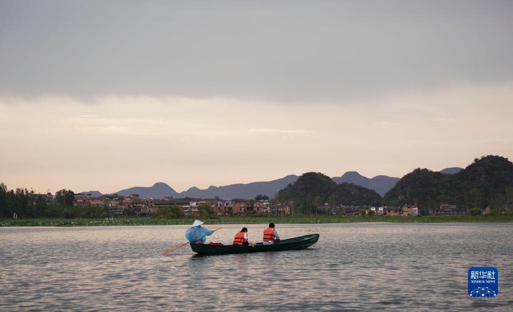 5月30日,游客乘船在普者黑景區仙人洞村游覽。