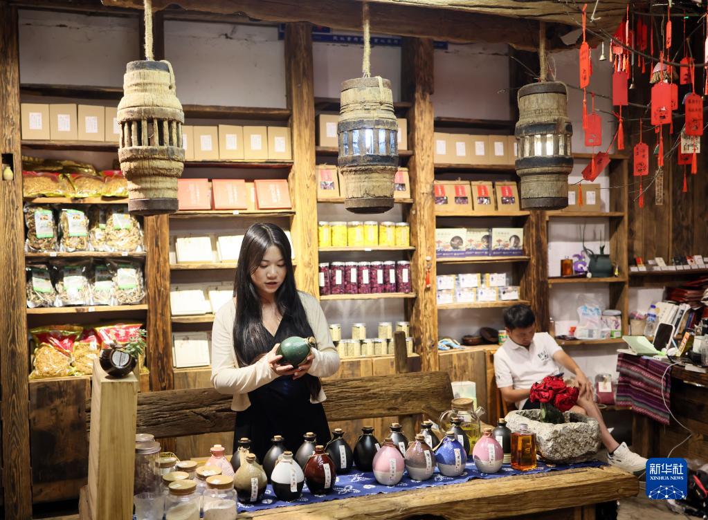 5月30日,在普者黑景區仙人洞村一家特產店,工作人員在介紹商品。