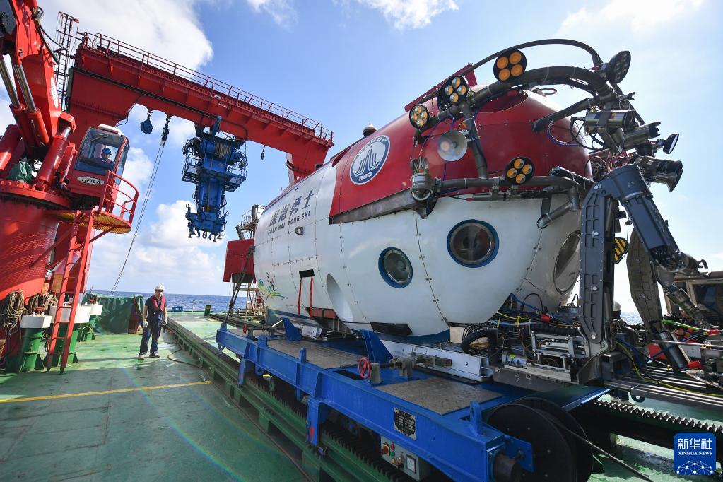 這是在“探索一號”科考船上拍攝的“深海勇士”號載人潛水器,該潛水器用于水下考古數據采集(5月26日攝)。