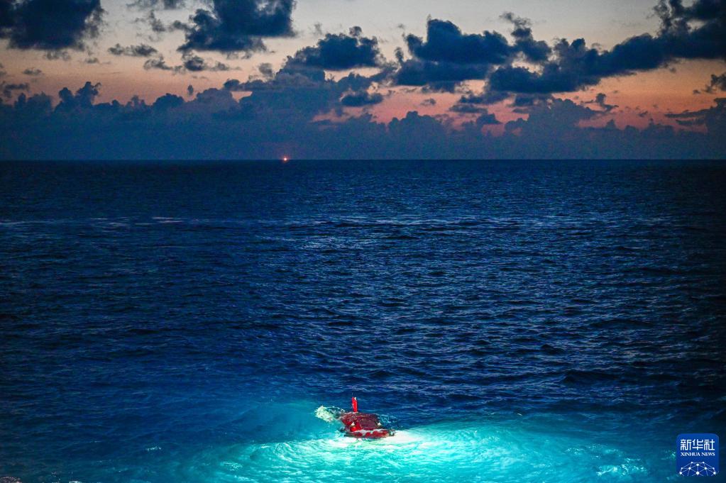 在結束當日的水下調查后,搭載著考古隊員的“深海勇士”號載人潛水器浮出海面(5月27日攝)。